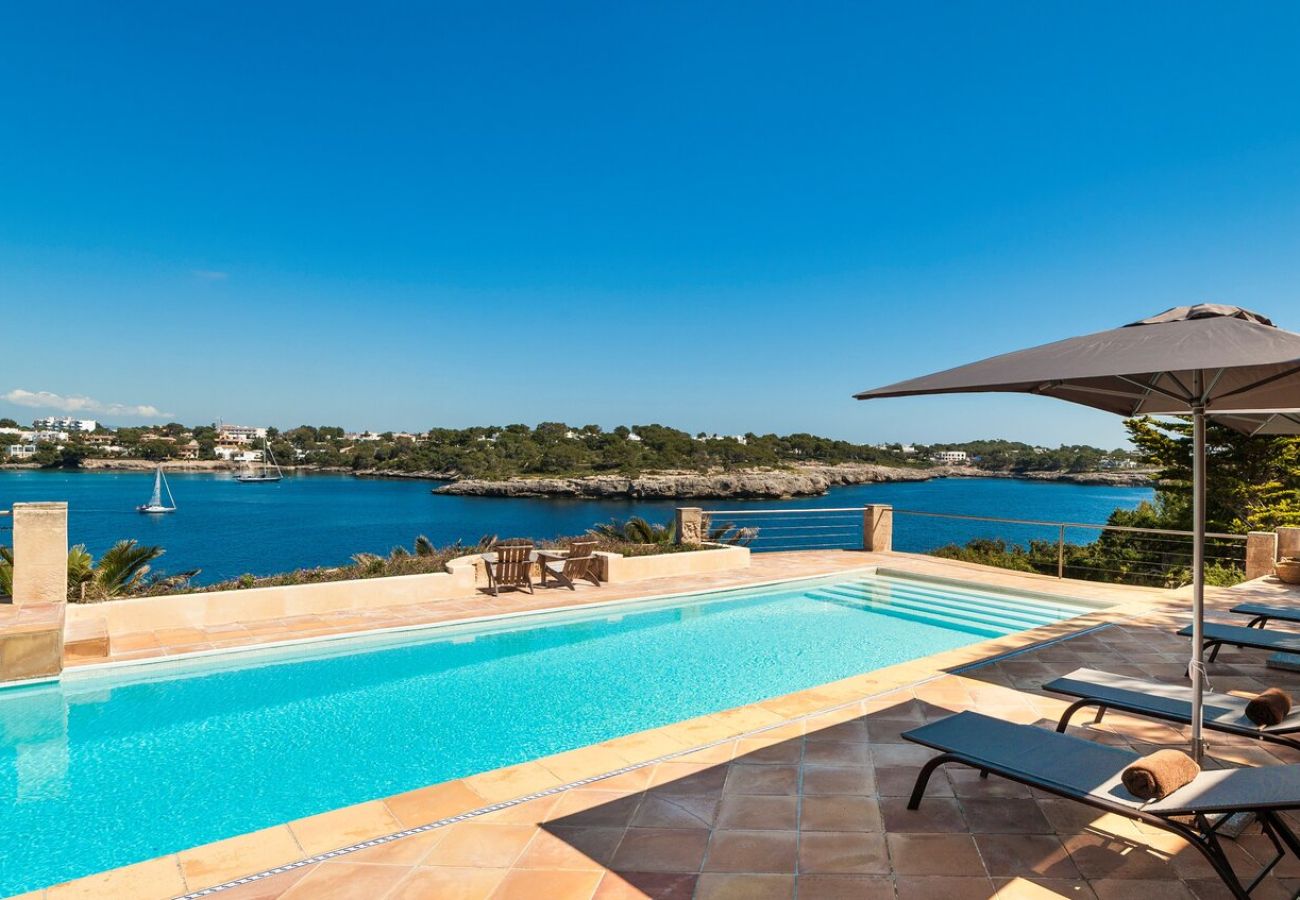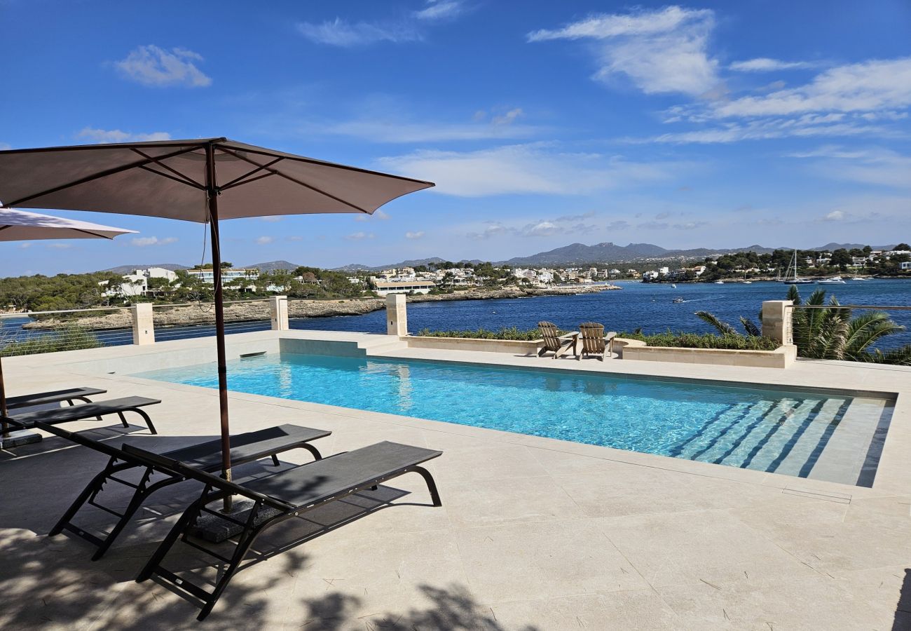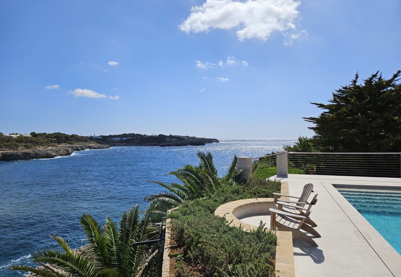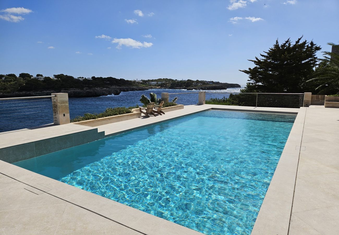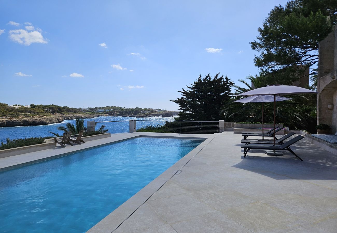 Villa Frontline Sa Torre is a modern new-fashioned holiday villa with a beautiful poolside area right in front of the sea in Porto Petro, Mallorca