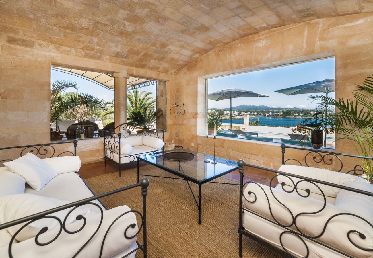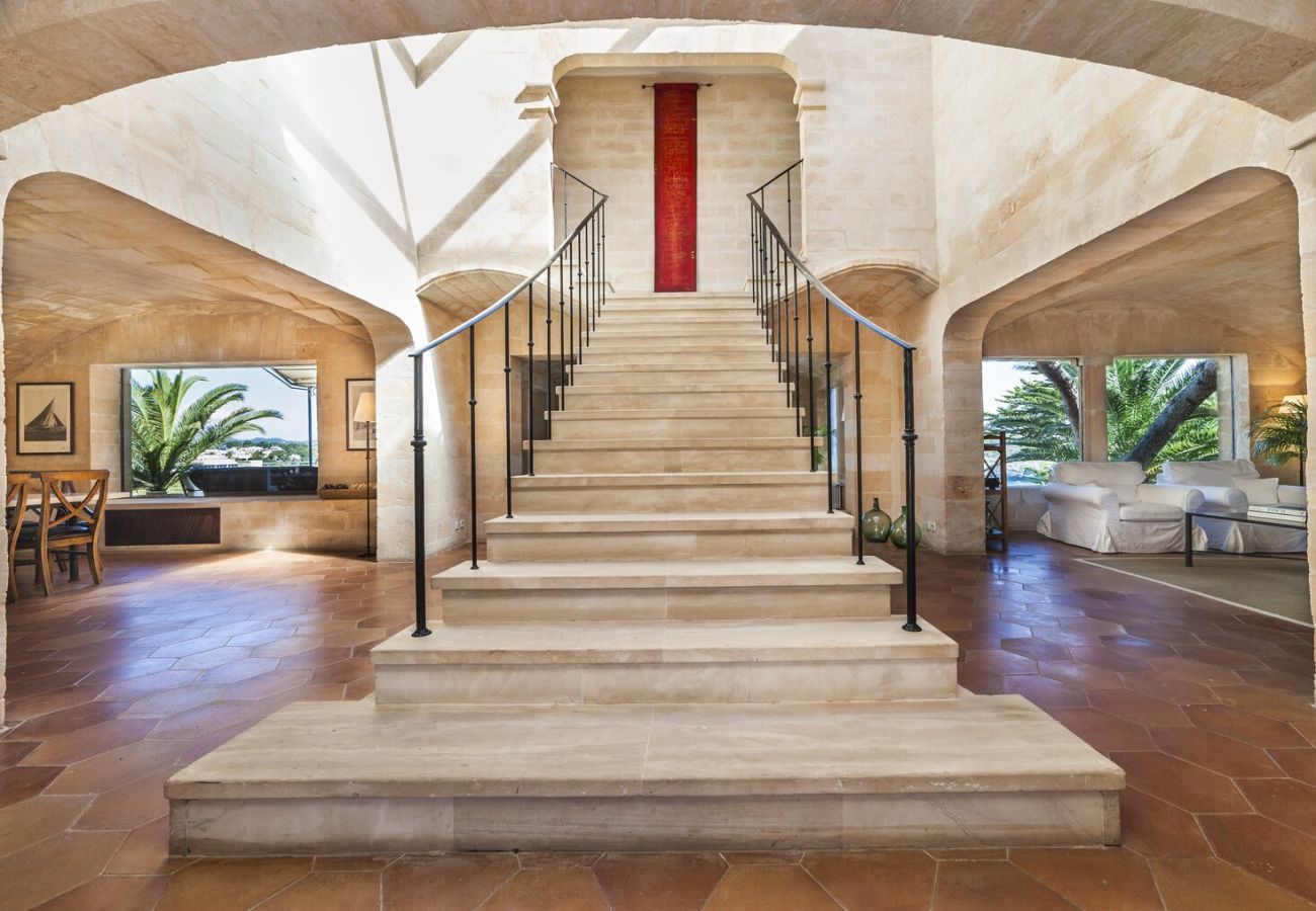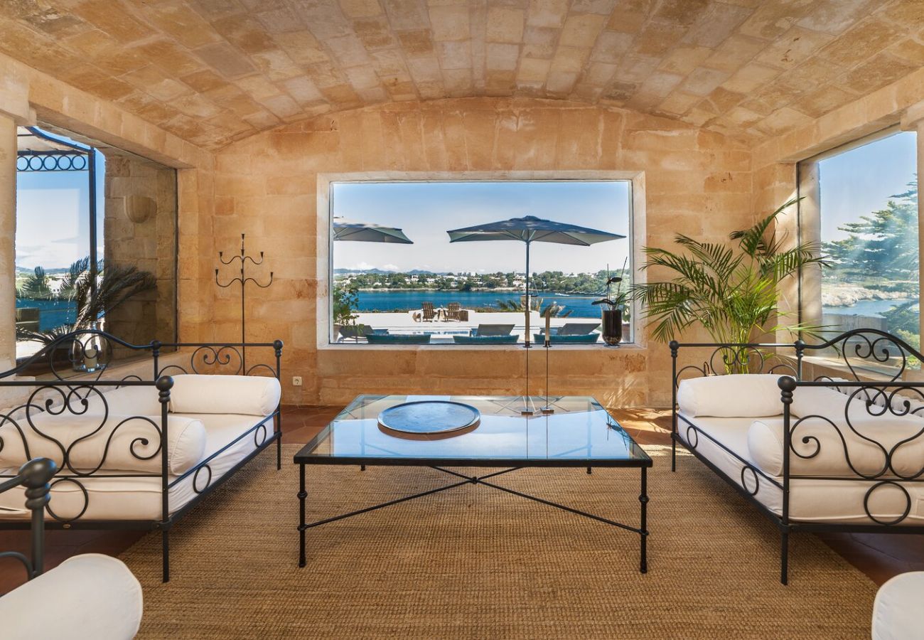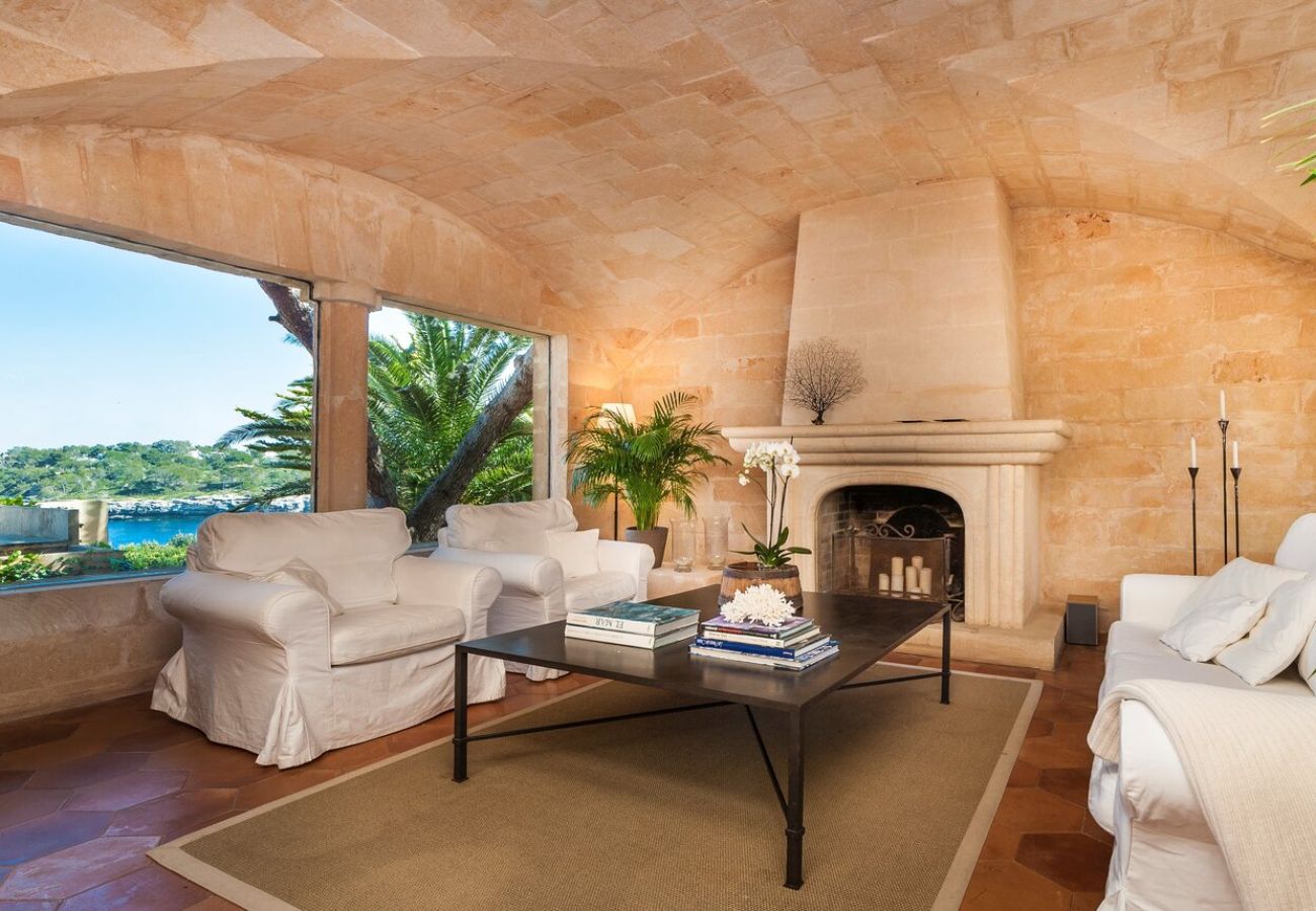 This magnificent villa is ideal for those who enjoy the beach, as there are several beaches nearby, such as the beautiful crescent of sand and turquoise waters of Cala Mondrago. The nearest beach, Calo des Homes Morts can be seen from the house and Cala Sa Torre is only about 400 meters away. The charming shops and restaurants of waterfront Porto Petro are also within walking distance. The villa is a stylish family residence, featuring natural stone walls and calming neutral interiors that exude a sense of luxurious comfort. The ground floor features a well-equipped kitchen and a spacious open-plan living room with two separate sitting areas and a dining area. This space is filled with natural light from large picture windows and offers beautiful views of the sea. French doors open to a covered dining terrace and an outdoor lounge area.