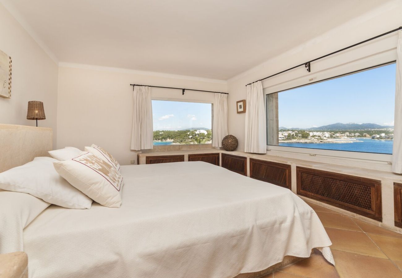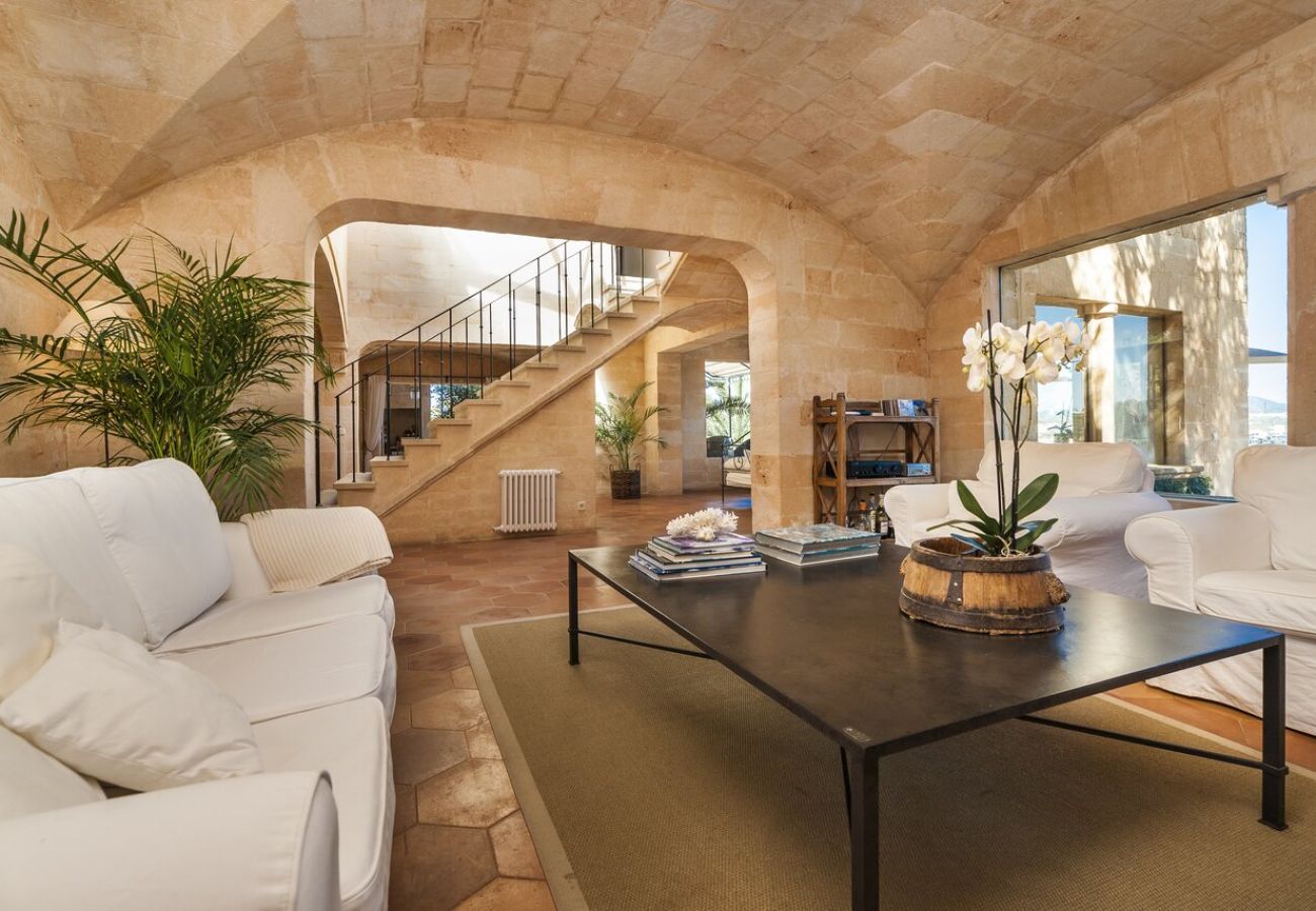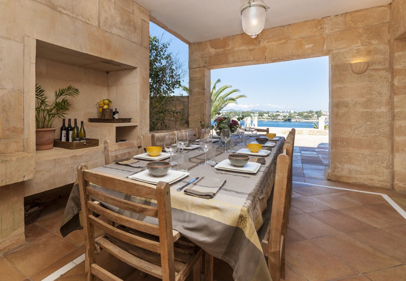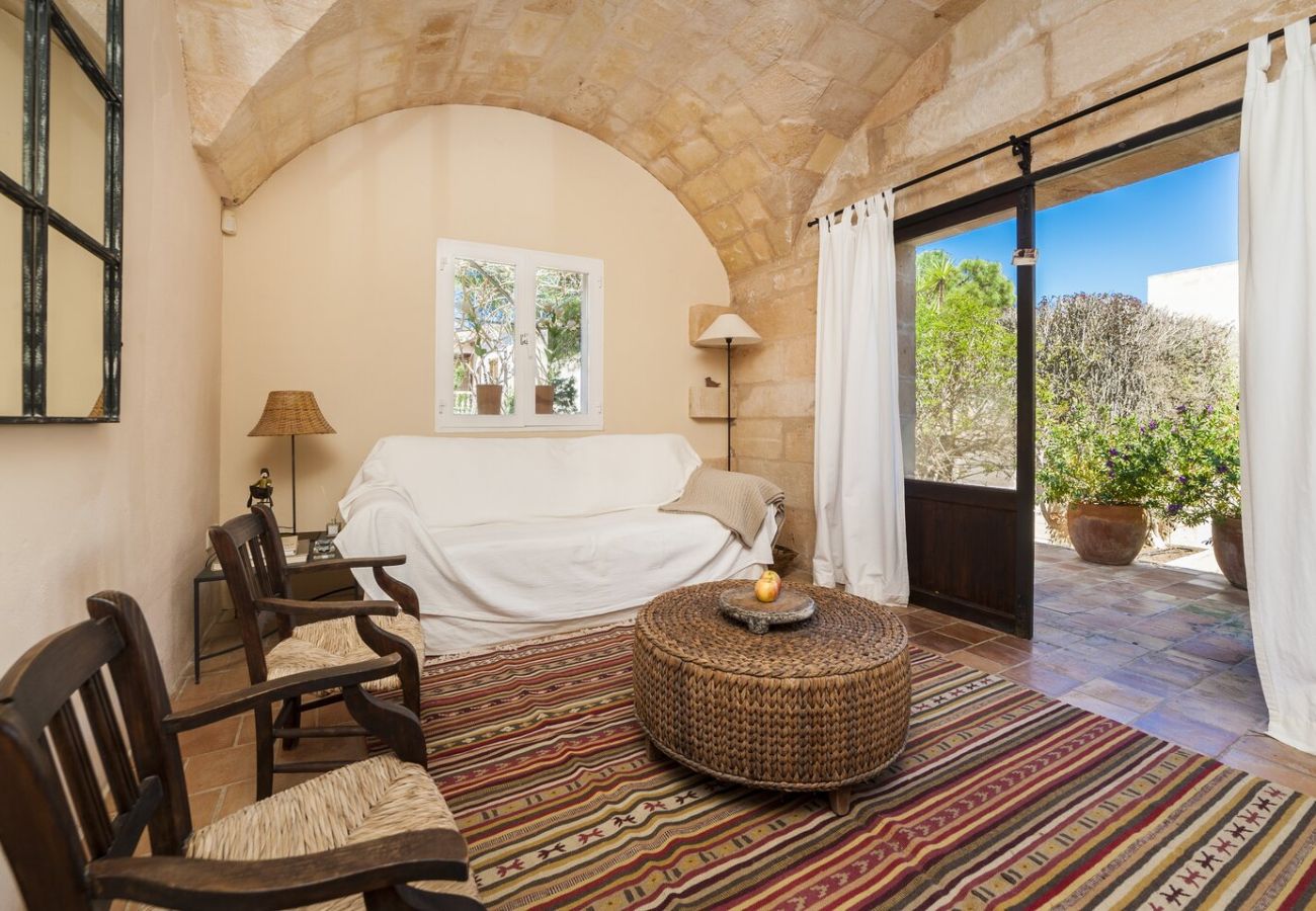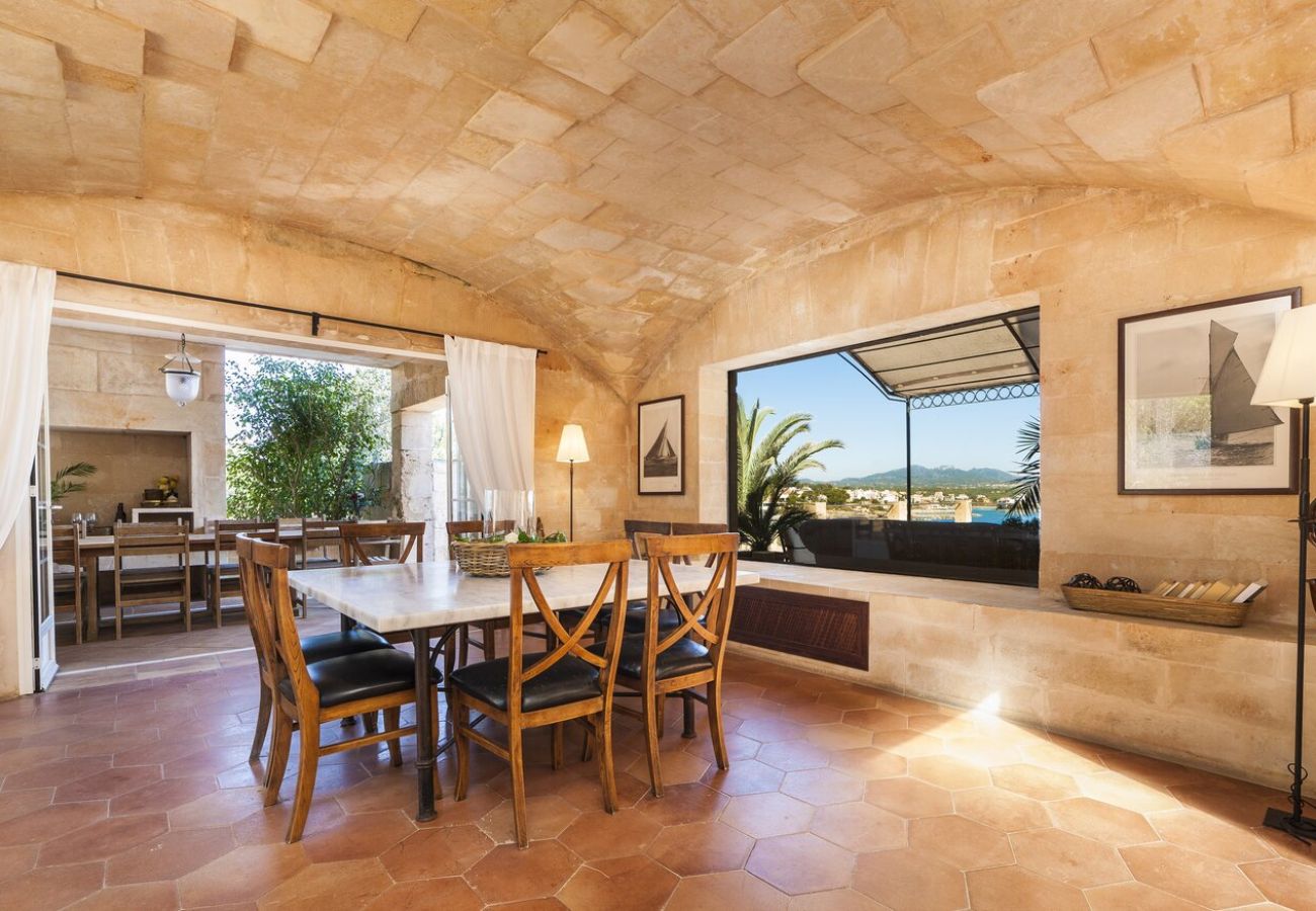 This magnificent villa is ideal for those who enjoy the beach, as there are several beaches nearby, such as the beautiful crescent of sand and turquoise waters of Cala Mondrago. The nearest beach, Calo des Homes Morts can be seen from the house and Cala Sa Torre is only about 400 meters away. The charming shops and restaurants of waterfront Porto Petro are also within walking distance. The villa is a stylish family residence, featuring natural stone walls and calming neutral interiors that exude a sense of luxurious comfort. The ground floor features a well-equipped kitchen and a spacious open-plan living room with two separate sitting areas and a dining area. This space is filled with natural light from large picture windows and offers beautiful views of the sea. French doors open to a covered dining terrace and an outdoor lounge area.