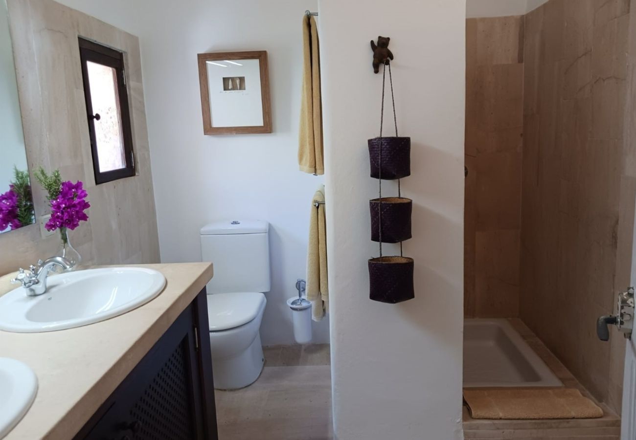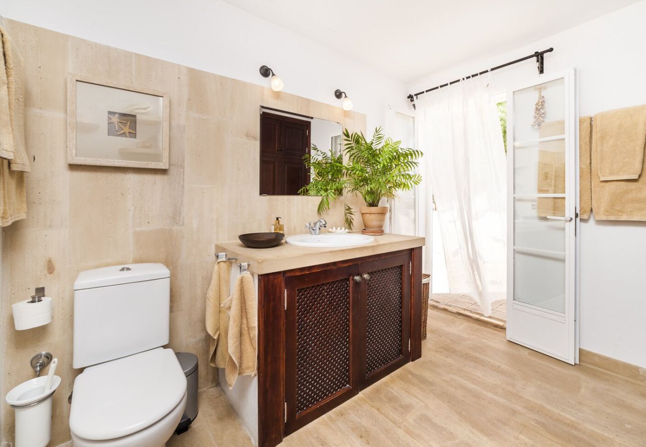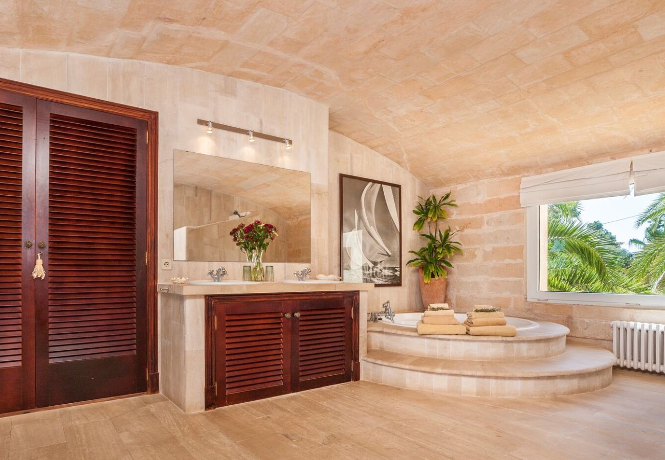 A stunning stone staircase leads to the first floor, where the master bedroom is situated. The master bedroom boasts sea views and a spacious en suite bathroom with a sunken bath and separate shower. Additionally, there are two more bedrooms on this floor; one double bedroom with access to a furnished terrace, with magnificent views over the bay of Portopetro, perfect for relaxing or sunbathing, and a twin bedroom with an en suite shower room.