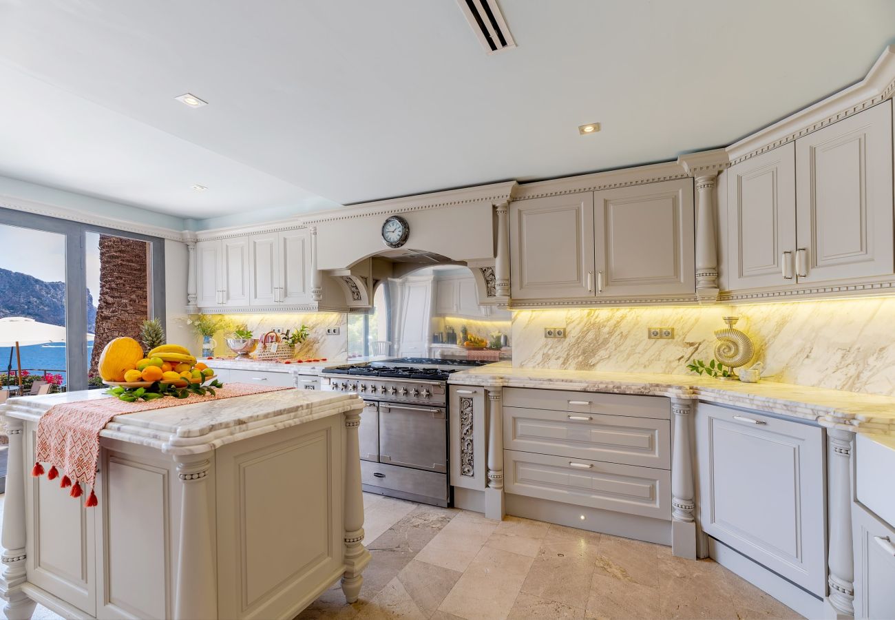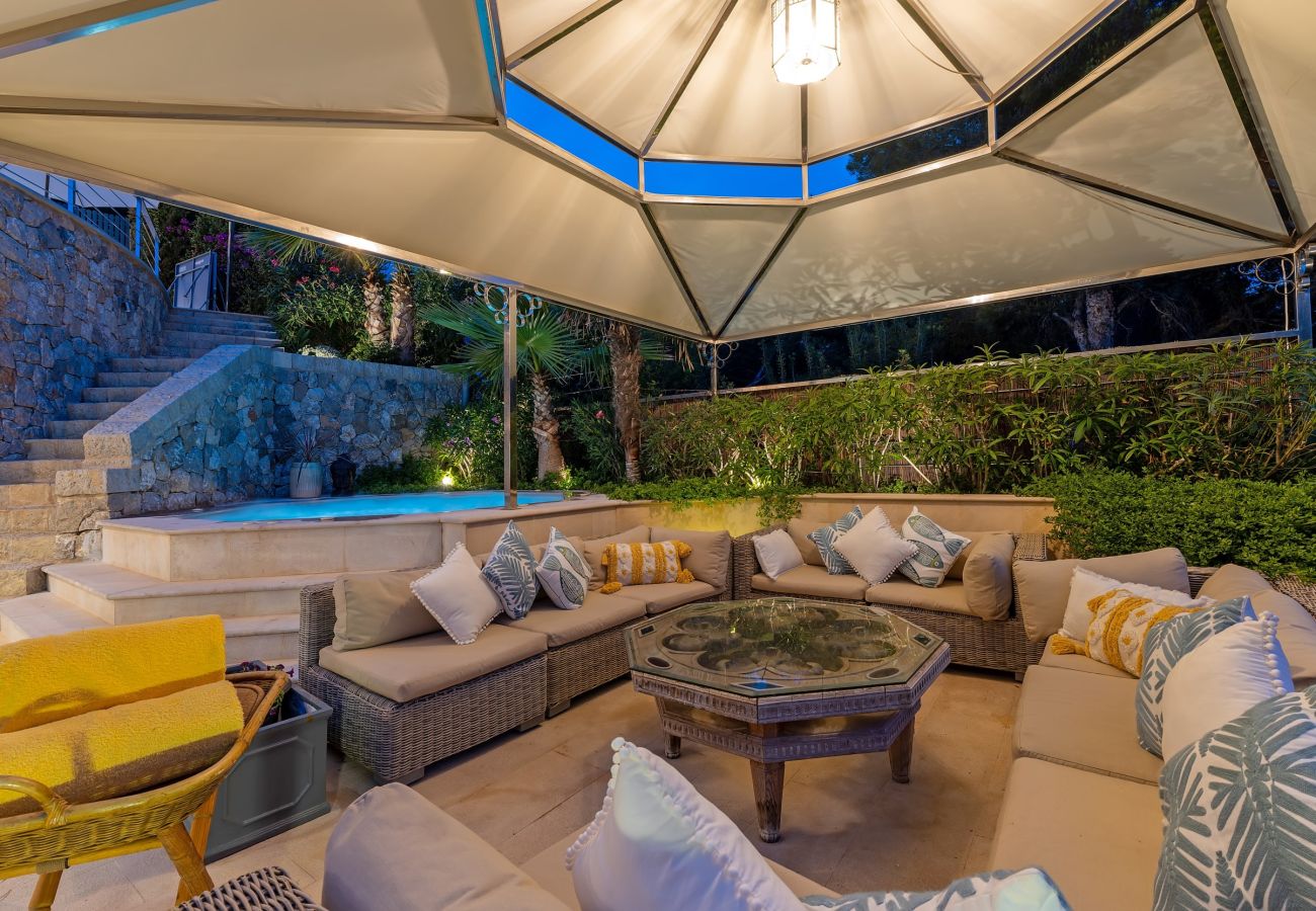 Situated at just below pool level the Jacuzzi terrace has a wet bar, Sonos music system, WI-FI and an adjoining, comfortably furnished relaxation area. Just a few flights of steps allow for access to the expansive boat house terrace giving private gated sea access. The area in front of the sea is paved and illuminated for guest use. Use of a private mooring and a boat dock for tender access.