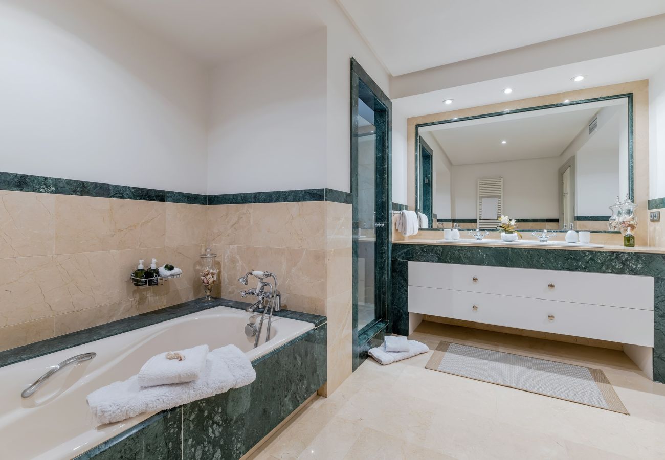 A more intimate floor – the sitting room has a dual aspect gas fireplace, recessed television and a built in cocktail bar. The master bedroom (Marmassen Room) and master guest (Harbour Room) are also situated on this level. All three rooms on this level give access to a shaded chill out terrace which overlooks the sea, pool and gardens. A guest WC and the staff apartment (independent access) are also on this level.