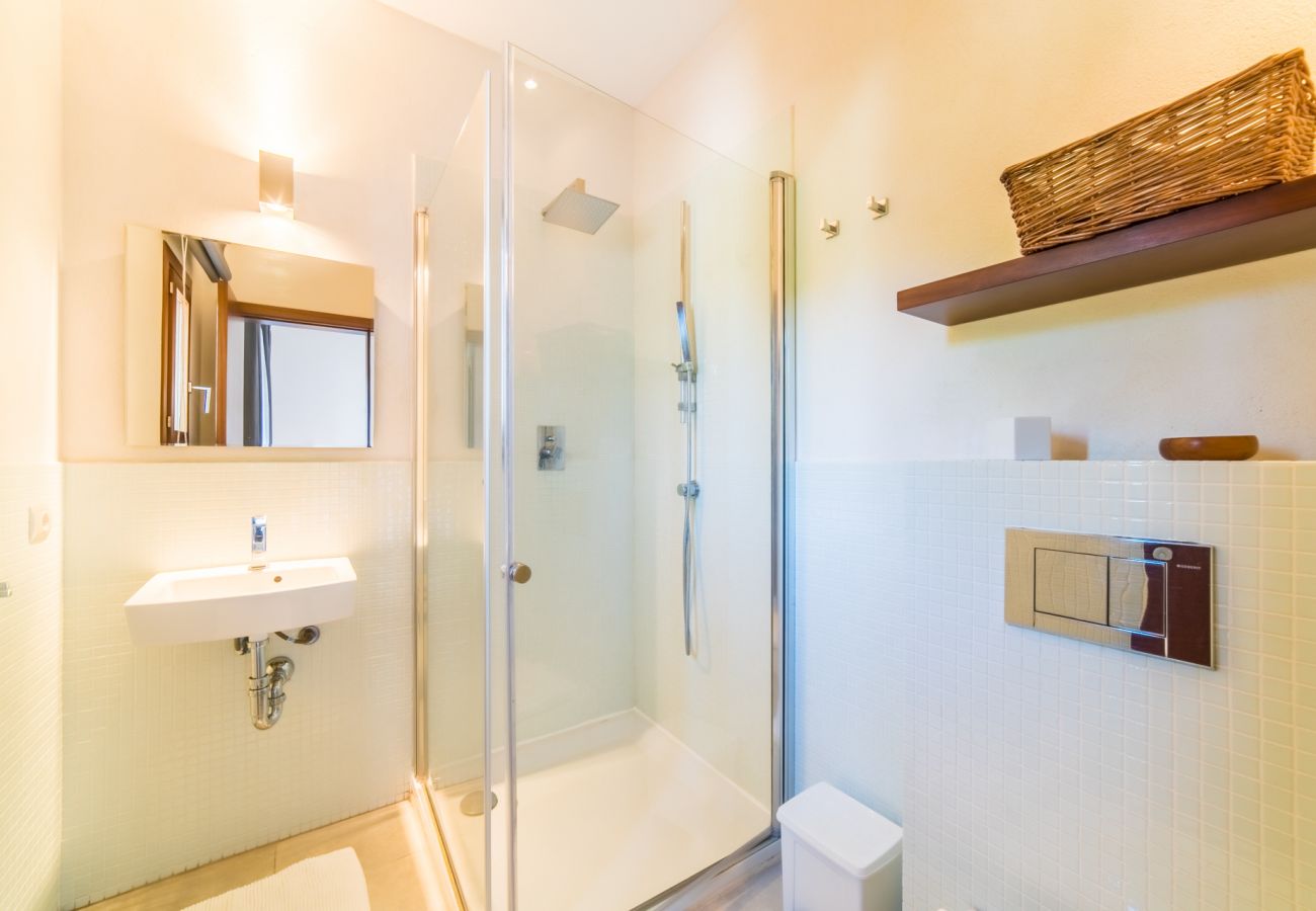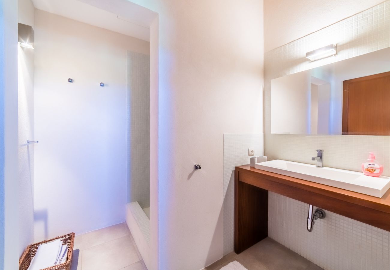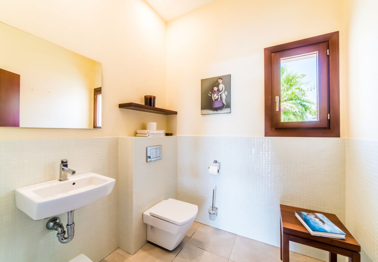 Villa Son Sard has been recently built and provides a modern luxury villa in Mallorca offering accommodation for up to 12 people – with 6 bedrooms in the main house. The first floor of Villa Son Sard comprises: two double master bedrooms with en-suite, one with bath and shower the other with shower only, both have spacious terraces overlooking the pool. On the ground floor you will find open plan dining and sitting area on one side of this villa, and on the opposite side are five further bedrooms, each with private bathrooms (all with shower) – 3 twin/double and 2 twins, living room with beautiful art pieces, open plan fully equipped kitchen and fireplace.