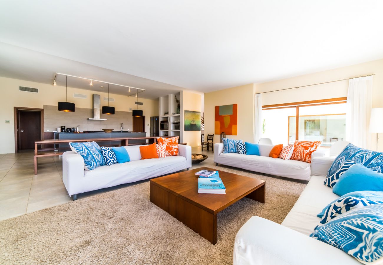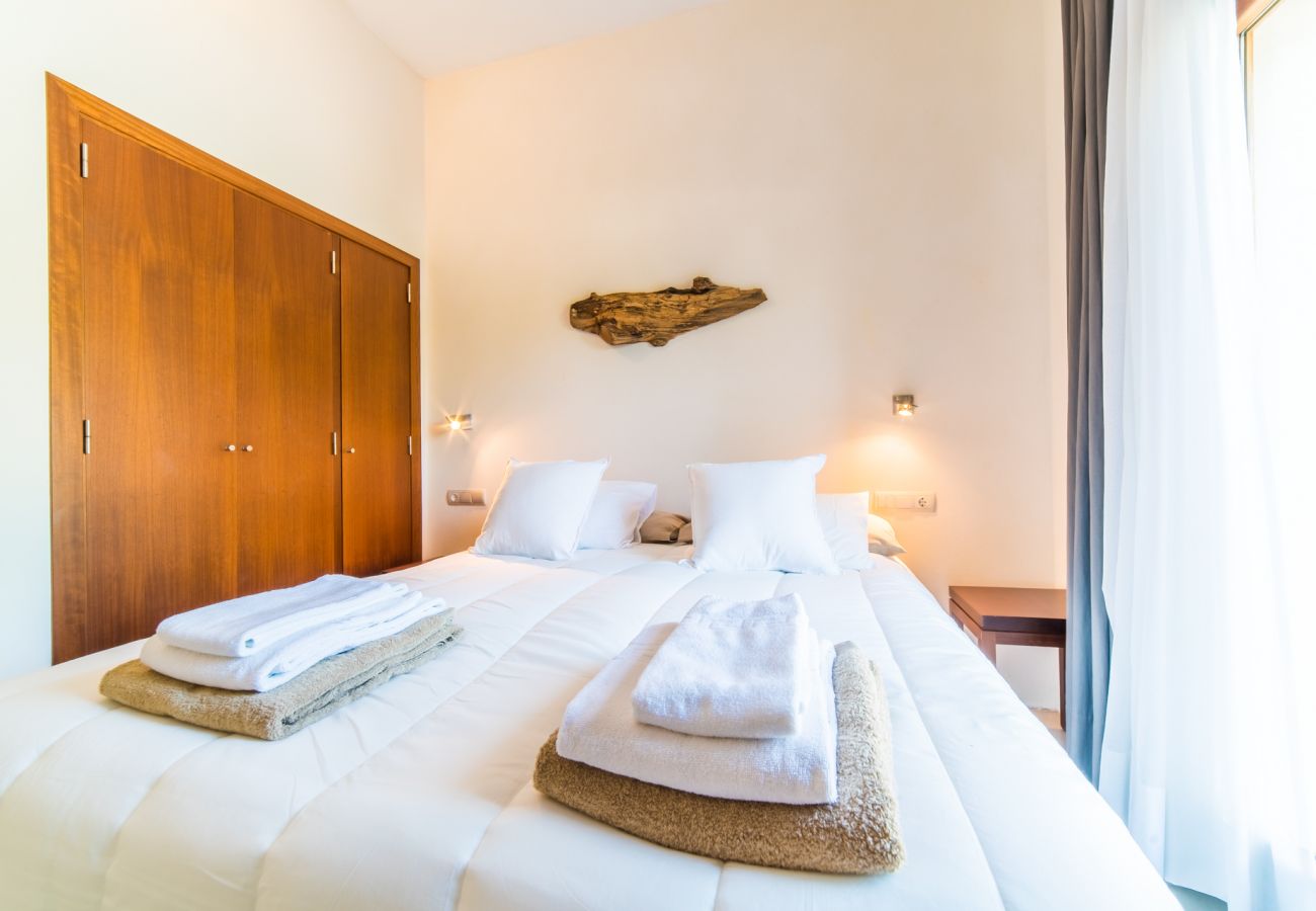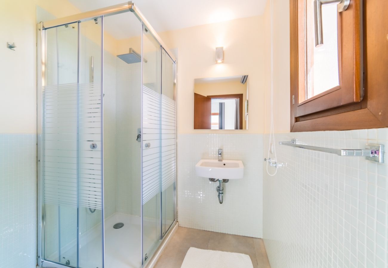 Villa Son Sard has been recently built and provides a modern luxury villa in Mallorca offering accommodation for up to 12 people – with 6 bedrooms in the main house. The first floor of Villa Son Sard comprises: two double master bedrooms with en-suite, one with bath and shower the other with shower only, both have spacious terraces overlooking the pool. On the ground floor you will find open plan dining and sitting area on one side of this villa, and on the opposite side are five further bedrooms, each with private bathrooms (all with shower) – 3 twin/double and 2 twins, living room with beautiful art pieces, open plan fully equipped kitchen and fireplace.
